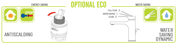 CARTUCCIA A RISPARMIO ENERGETICO ENERGY SAVING: una specifica cartuccia che permette di aprire in sola acqua fredda quando la leva si trova in posizione allineata rispetto alla bocca del rubinetto. Questa nuova cartuccia evita la richiesta indesiderata di acqua calda, permettendo perciò un risparmio energetico.